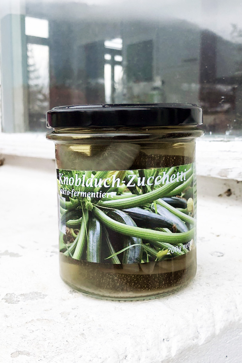 Zucchhetti-Scheiben mit Knoblauch und Zwiebeln fermentiert. (nicht pasteurisiert, muss im Kühlschrank aufbewahrt werden)